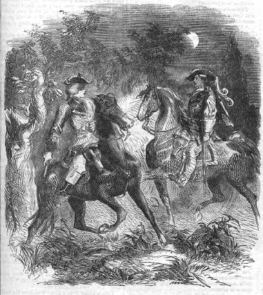 With two bounds, Daisy was by the side of the coach, and then bending down in his saddle so as to look in, Captain Heron said politely, "Ladies and gentlemen, I will trouble you for your purses, watches, and jewelry !"