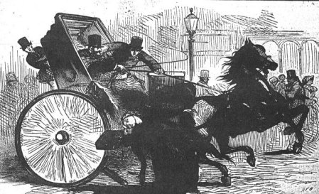 A poor-looking, thinly-clad old woman, apparently in a highly excited state, was disputing with one of the commanding creatures in plush (alias footmen), who seemed to be refusing her admittance.
